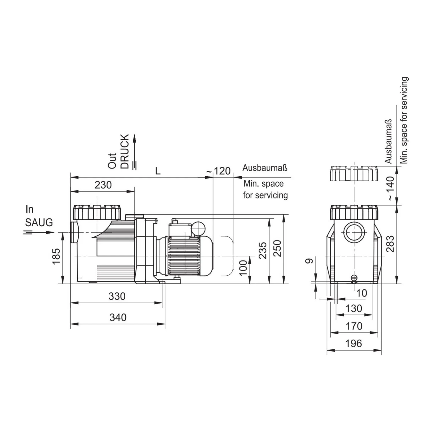 Schwimmbadwasser-Umwälzung in Filteranlagen, aufstellbar max. 3 m oberhalb oder max. 3 m unterhalb des Wasserniveaus.